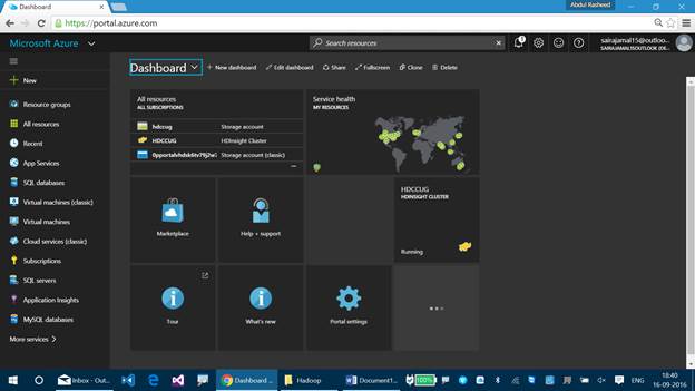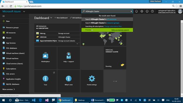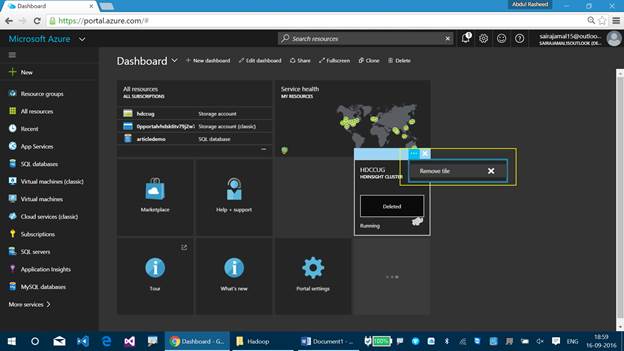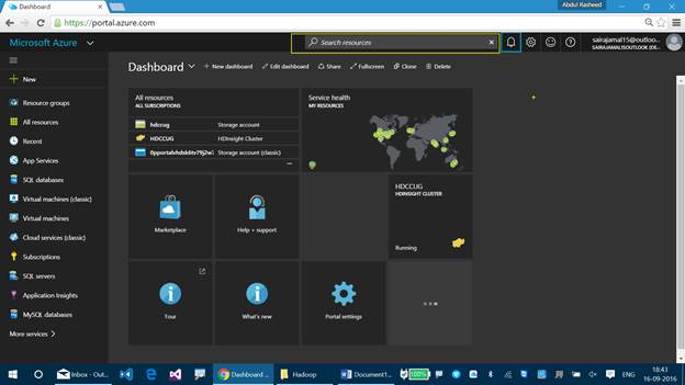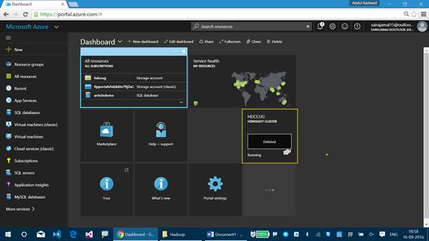 You can find the status of the HDInsight Cluster which is represented as running. If you cannot find the HDInsight Cluster on your Dashboard, then you can find it using the search resource option, available at the top pane.
