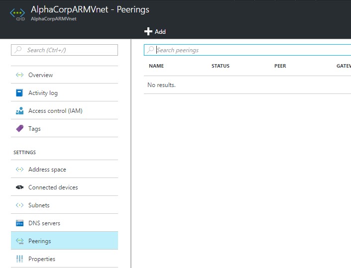 Currently this VNET is not integrated with other VNETs through peering so we see no entry here, let’s add new peering connection by clicking on Add button at top.