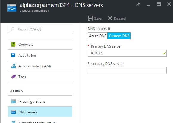 Once the peering is done successfully, we will try to log in to ARM VM which is in ARM VNET and will try to bring it on Azure AD domain. Browse to the VM’s NIC and configure DNS server address by selecting custom DNS option.