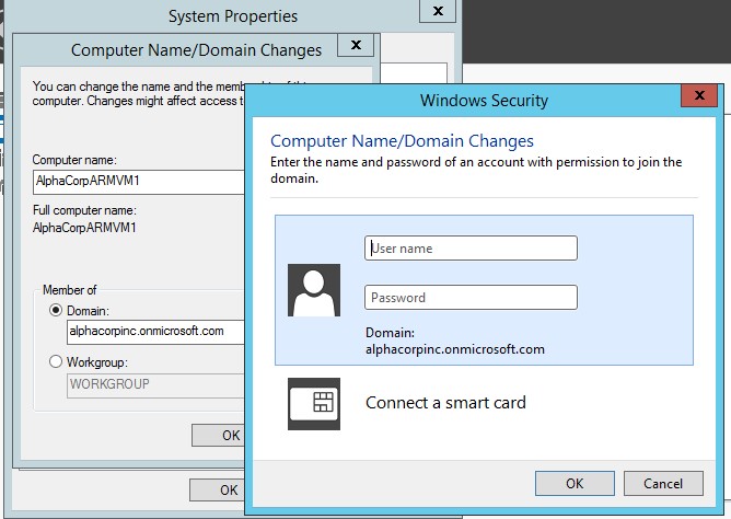 After entering valid credentials, ARM VM will be joined to the domain and you should see message like this