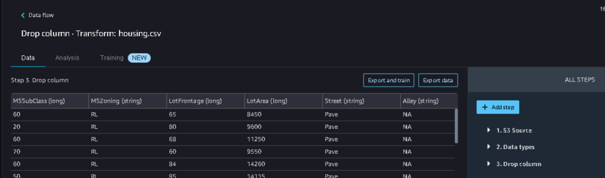 In the Data types * Transform section, we can add some steps for preprocessing. Click on + Add step.