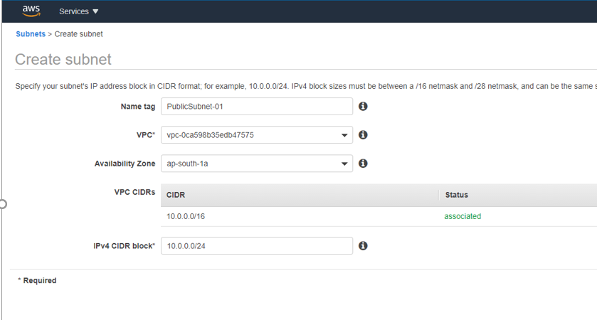 Public Subnet - Choose the name tag and select the VPC which we create in the last step and the availability zone,