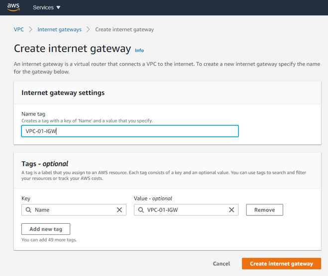 Create Internet Gateway – this will allow the communication between VPC and the internet so give the appropriate name tag here.