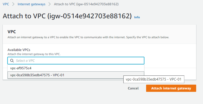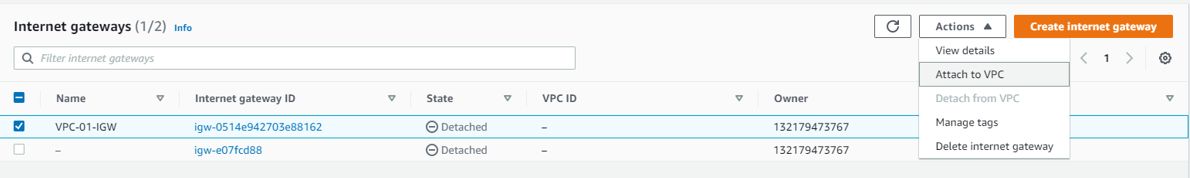 Let's attach the Internet Gateway to VPC by clicking on the Actions button and click to Attach to VPC.