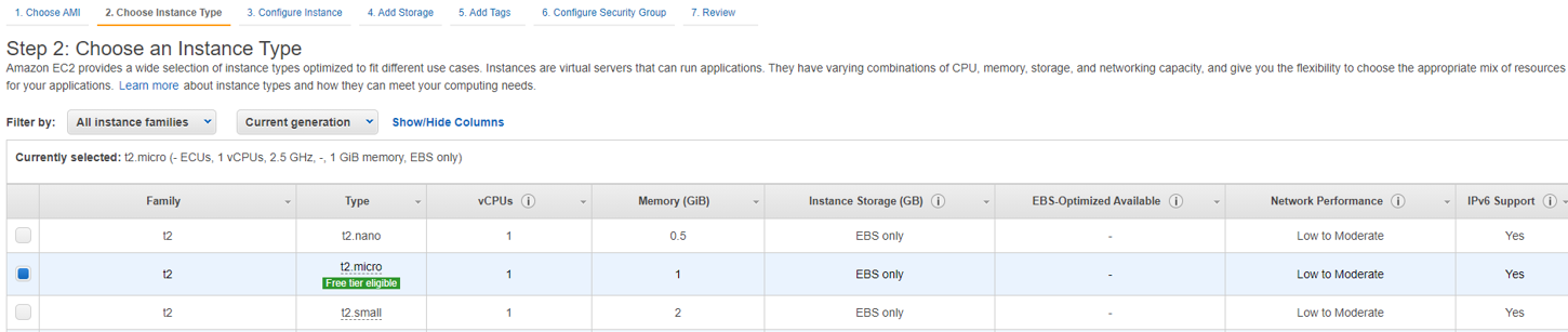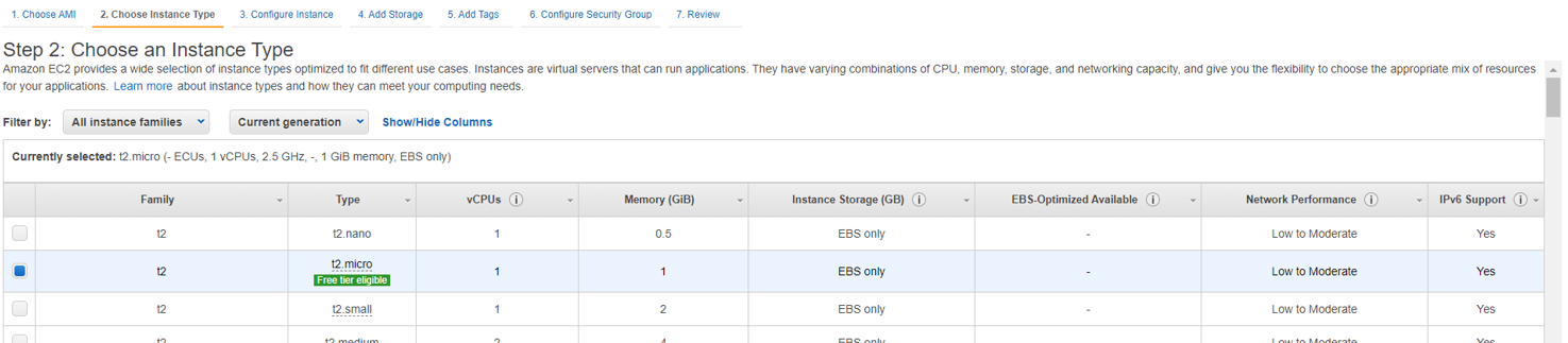 The next step is to choose our instance type which you select according to your requirement, I'm selecting here the free one t2.micro having 1 GB of memory and 1 CPU core