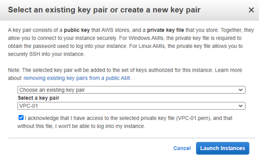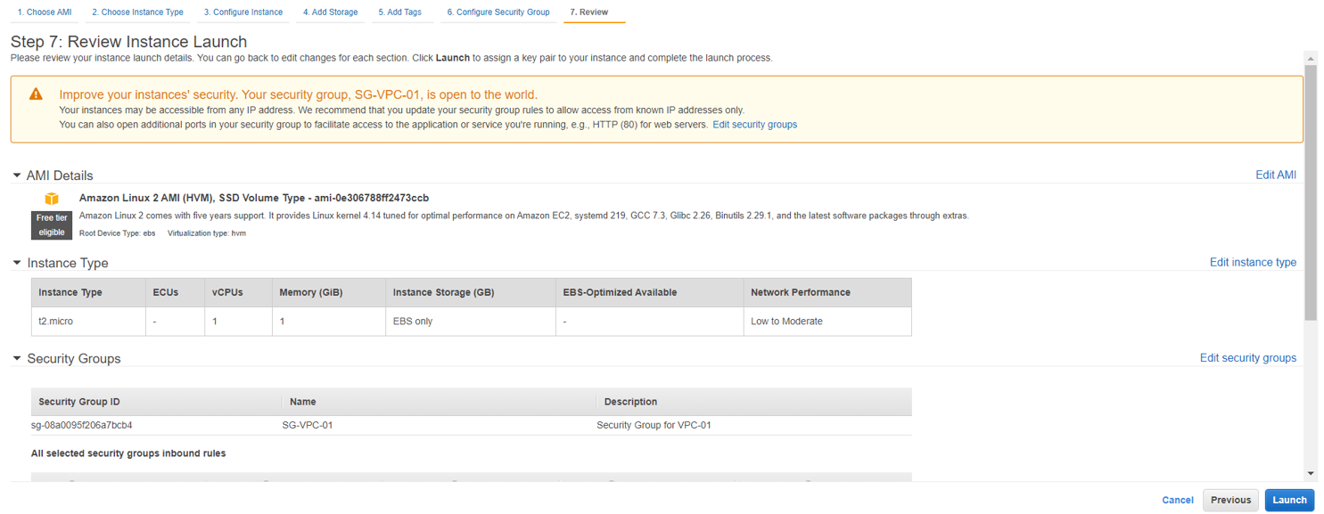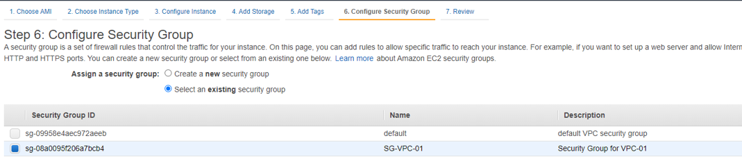 This time I select the existing security group which already defines the rules to allow specific traffic to reach this instance.