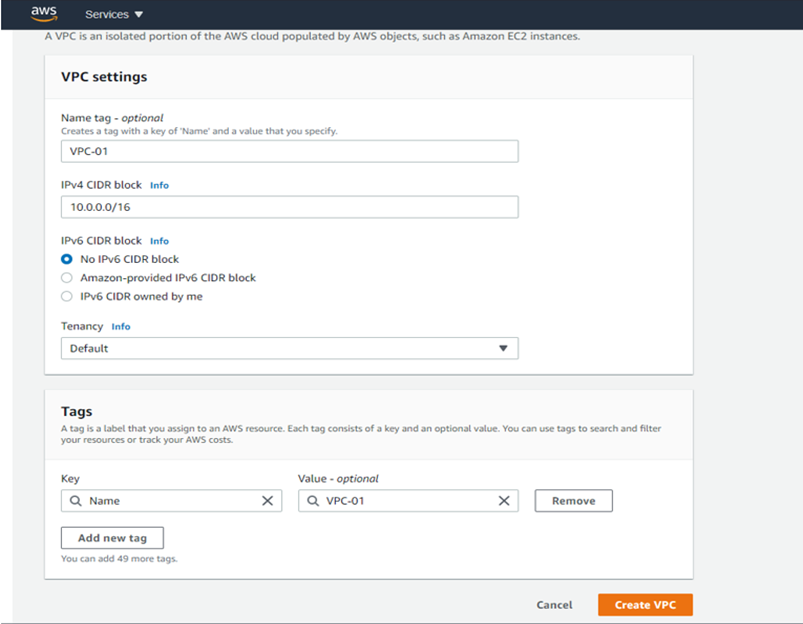 Create VPC - Give the VPC name and choose the IPv4 CIDR block which basically used for allocating IP addresses