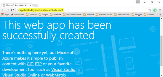 Within a few seconds, you will see your Web app is ready. For checking whether our app is ready or not, just visit the URL of the Web app, which we have created in the steps, mentioned above.