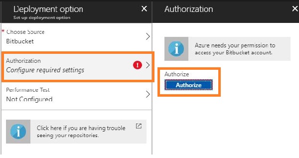 Select Authorization which will take you to Bitbucket application to complete your authentication process with Bitbucket from Azure.