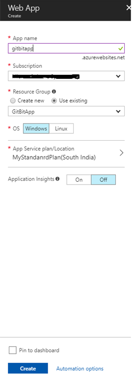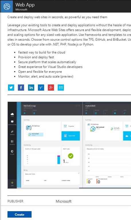 Click on + New and search web app in marketplace, select the web App and provide the following details to create web app as shown in following figures