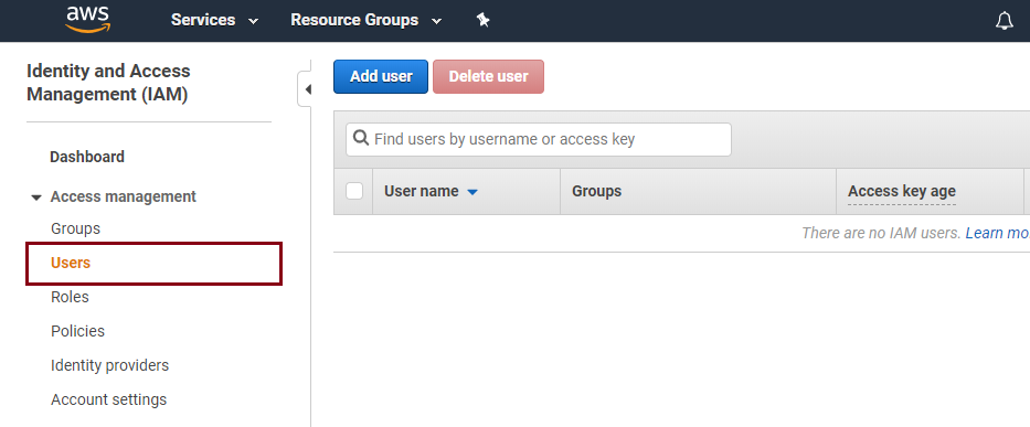 When we enter this service, we will go to the Users section in the options menu and select Add User. The goal is to create a user, which will be used to associate the AWS services to be used, as it is not recommended to provide our root user access privileges.