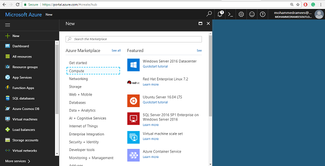 Log in to the Azure portal which will take you to your customizable dashboard and click on New >> Compute.