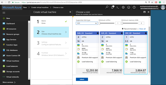 Clicking OK on completion will take you to Step 2 where you need to pick the Virtual Machine size according to your requirement. You can choose from the recommended list populated with your disk type selection. You can click on "View all" for listing out all the recommendations with the pricing and different configurations. Select any one and click on "Select" which will take you to the third step.