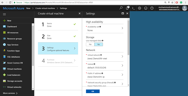 The first setting they are asking is whether we want to group the VMs (In case of two or more VMs) into some availability set to ensure and meet 99.95% Azure SLA and the next one is storage which is defaulting to yes for the Managed Disk feature. What it simply means on selecting yes is that you need not create and manage your own storage account; it will be taken care of by them.