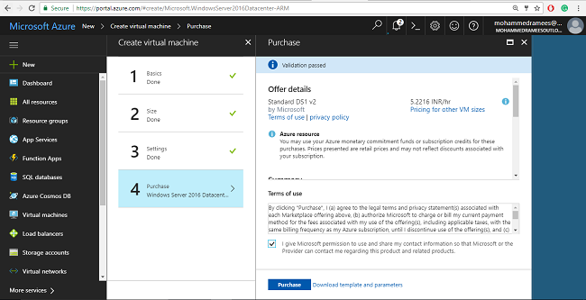 On clicking OK, it will check for the final validation and be accepting the terms. A click on purchase will kick off the deployment of the virtual machine.