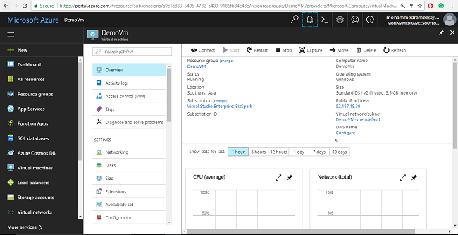 On the top, you have got some most used controls to work with the VM. We can restart, stop, delete, we can capture a custom image if we've modified this computer and now we want to build our own image, and we can move it to a resource group other than the one that we're using now and by clicking the connect button will download a RDP file using which you can RDP to the server. Giving your user credentials will take you into a fresh VM