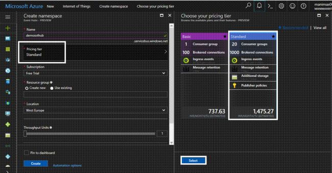 In the "Create namespace" blade, enter a namespace name. The system checks if the name is available or not. Then, choose the pricing tier (Standard) and press "Select".