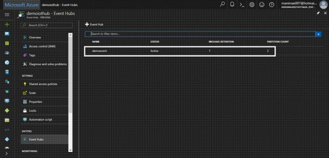 In the list of Event Hubs, it shows the newly created event hub name for additional use.