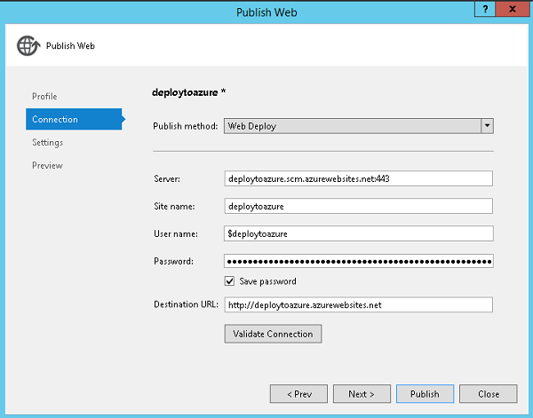 The ‘Publish Web’ window will pop up. Here, four sections/tabs are there which we can go through. The ‘Profile’ tab is initially activated. The remaining three tabs get enabled one by one after we complete the settings of the previous tab. Will go with ‘Microsoft Azure Web Apps’ as Publish Target, as I need to deploy web application into Azure Web Apps.