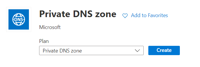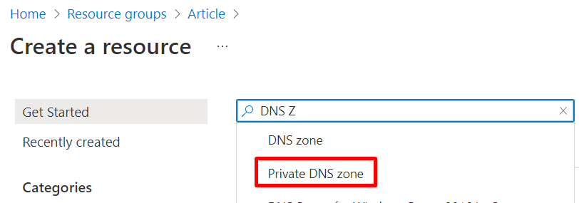On the Azure Portal, Click + Crate, and in the search bar, type DNS, and then select Private DNS zones.