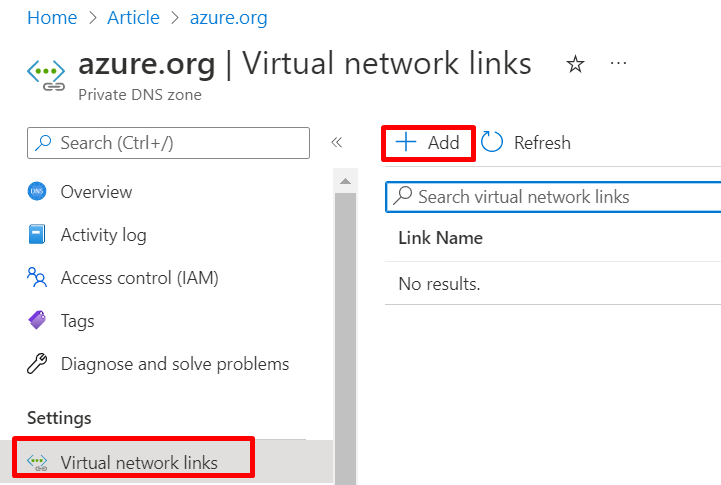 In our Private DNS zone (azure.org), select Virtual network links under the settings, and then select + Add.