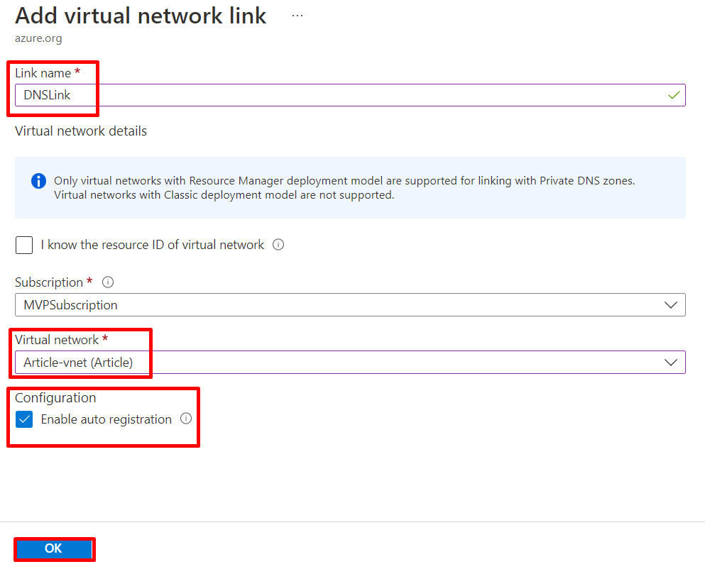 On the Add virtual network link, enter the name for the Link name, select the Virtual Network, select the Enable auto registration, and then click Ok.