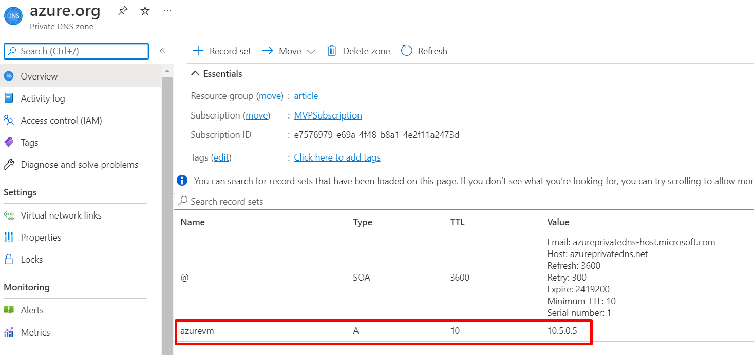 To verify records are added to the DNS zone, open the Private DNS zone, and we can find our Virtual Machine automatically added to our DNS zone.
