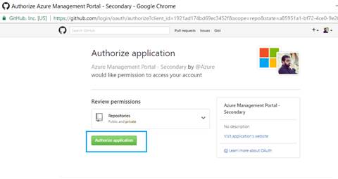 Once selecting source as GitHub, next step is to authorize our Web App with GitHub account to be used.