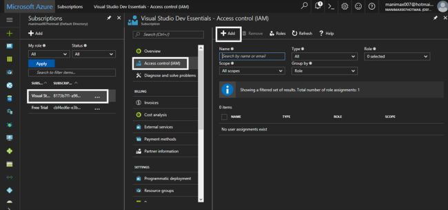 In the Subscription blade, choose your subscription type and click Access control (IAM). Then, press Add.