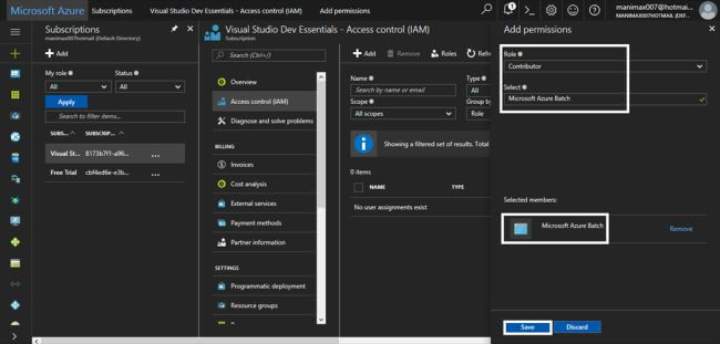 In the "Add Permissions" blade, select the Contributor role, search for the Batch API, and press "Save" to save the permission.