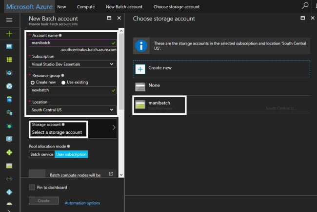 In the "New Batch Creation" blade, choose the descriptions as in the image below. For creating the storage account I have chosen the exsisting account, however, if you don't have one then choose the "Create New" option to create a new storage account. Then, choose POOL ALLOCATION to the User Subscription.