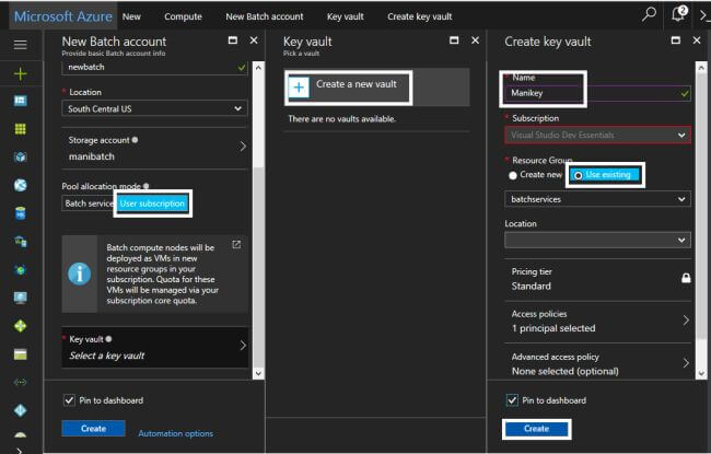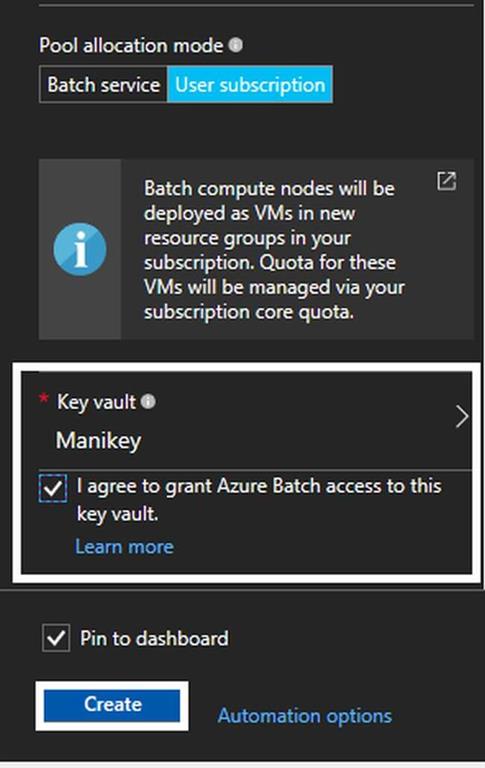 For keyvault, it shows the newly created key vault. Next, we choose to pin our Batch Service into the dashboard and click "Create" to create the account.