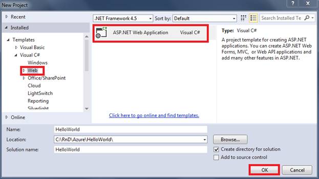 To setup MVC application in Azure, please click on “+”>>Web+Mobile>>Web App.