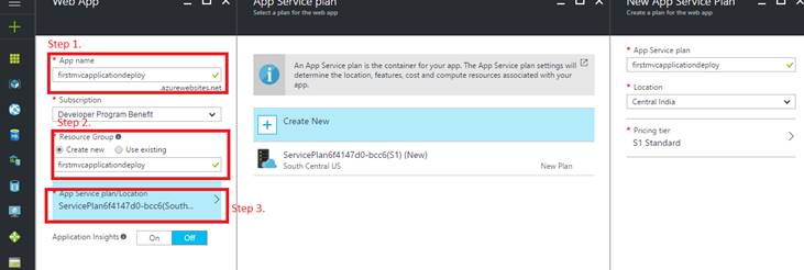 This will be used for pricing and helping Azure to deploy the app to the respective data centers which are near to your geographic location. (In this demo, I have created a new service plan “firstmvcapplicationdeploy” to “Central India” as it is near to my location).