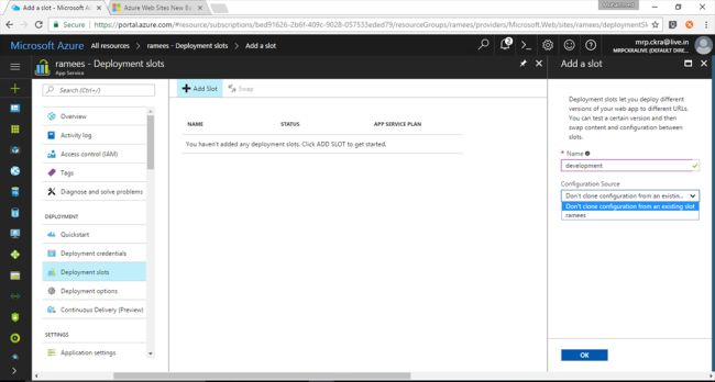 Click on "Publish" and select "Microsoft Web Apps" section again. Here, we can see that under existing web apps, there is a new item called development which is the slot we just created.