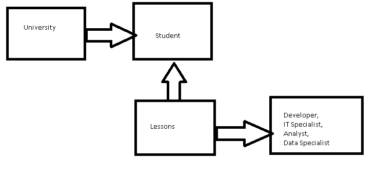A much more easy to understand example can be given about Universities-Lessons-Professional triangle of relationship. Student goes to a university, attends a class, passes exams, finishes school and then become a professional: