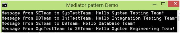 As you can see above in the MeetingRoom class we have created a collection to store teams while registration and same collection is used to provide appropriate team object in the SendMessage method. Subsequently team object is used to invoke ReceiveMessage dynamically or in polymorphic fashion.