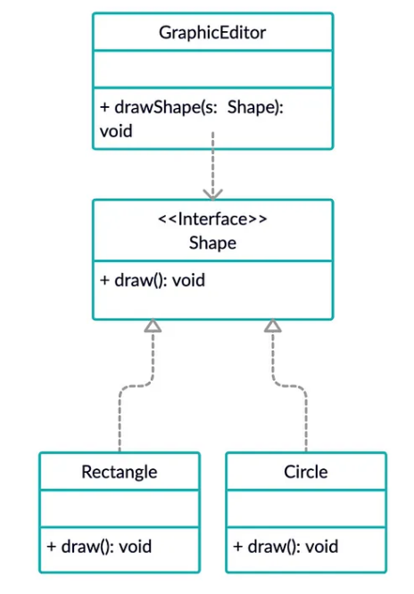 To resolve the issue, we could introduce a layer of abstraction, which is the Shapeinterface, between the GraphicEditor class and the different shape classes that will implement this interface, as shown below.