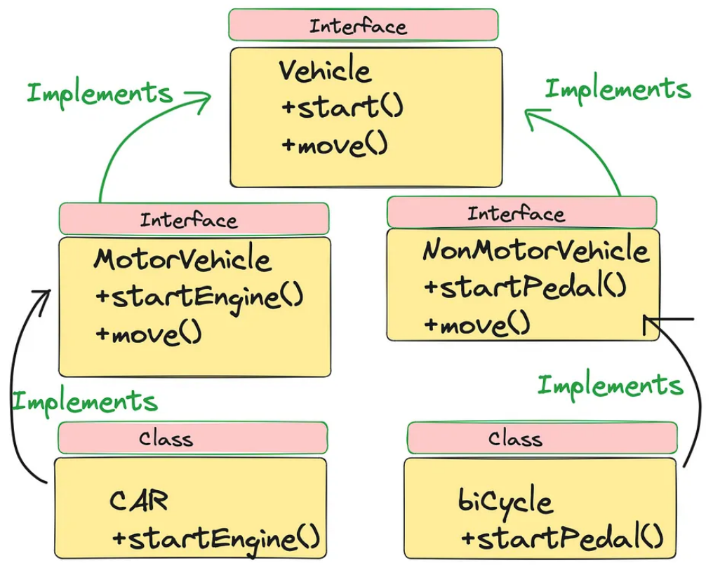 Example: - `Shape` is an interface with method area() and volume(), - `Square` and `Rectangle` classes are implementing `Shape` interface. - But problem is they don't need the method volume() since they are 2D shapes. It violates ISP. - Hence we need to have a separate interface for 3DShapes and then extend from them.