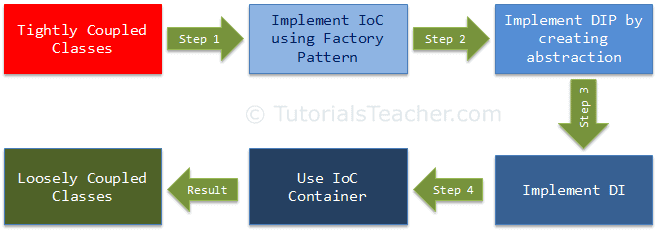 - Resolve: When using the IoC container, we don't need to create objects manually. The container does it for us. This is called resolution. The container must include some methods to resolve the specified type; the container creates an object of the specified type, injects the required dependencies if any and returns the object.