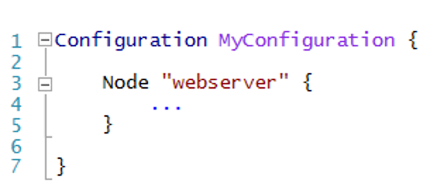 • To use DSC to configure your environment, first, define a Windows PowerShell script block using configuration keyword.