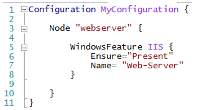 • Inside the node configuration block, define the resource blocks to configure and specify DSC resources. A resource block starts with the name of the resources followed by the identifier you want to specify for that block, then brces{} to delimit the block.