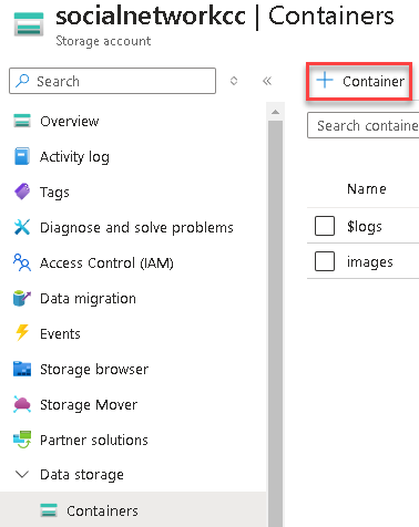 Then, go to Containers under Data storage and create the container images and chose the Anonymous access level to Blob.