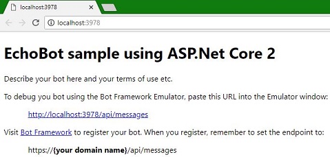 Hit F5 to test a bot application. It will host an application with IIS Express and open the browser with Bot application details. To understand the control flow, insert breakpoints in ConfigureServices, Configure method of Startup.class and OnTurn method of EchoBot class.