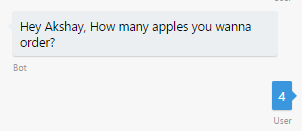 Get the user name from results parameter and save it to dialogData of the session. Prompt for the number of apples. Wait for user input which should be of type
