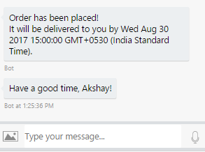 Get the time for delivery from results parameter and save it to dialogData of the session. Say goodbye to the user.