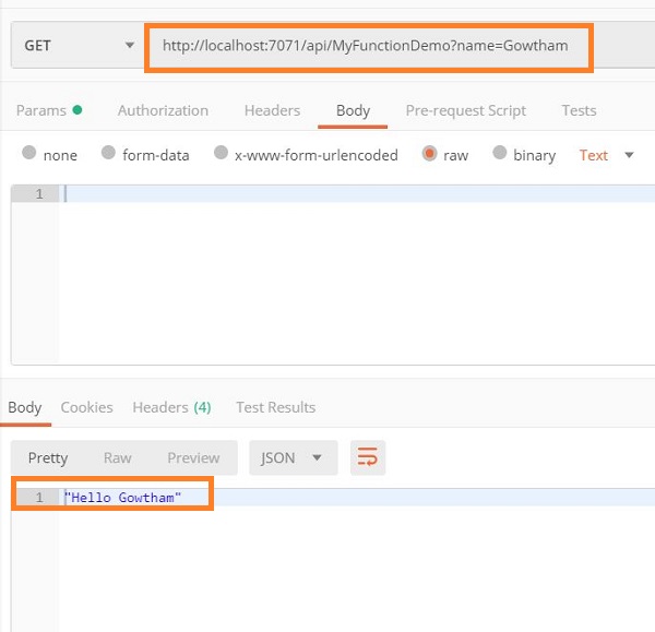 Run the endpoint http://localhost:7071/api/MyFunctionDemo in the Postman tool.
