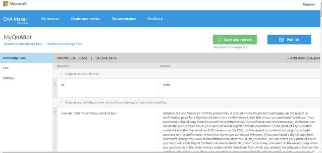 - After completing all the changes, we need to “Save and retrain” the Bot Service.