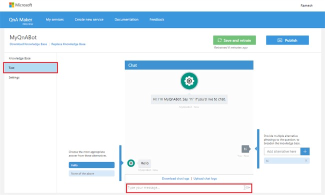 - We can test the Bot by clicking on Test tab. Enter the question and in reply, the Bot service will give a relevant answer.