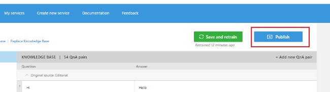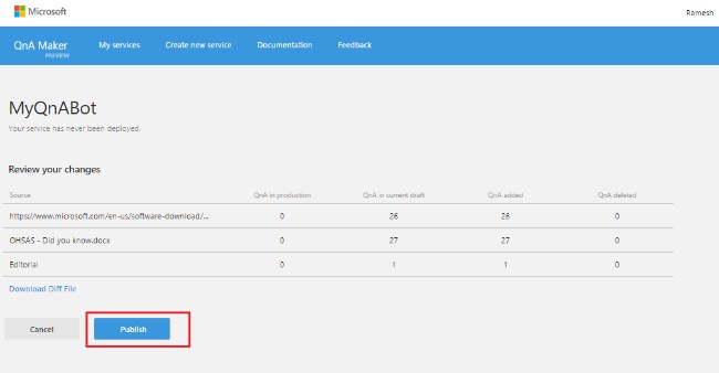 - We can review the changes made to the QnA Bot Service and click on "Publish" button.